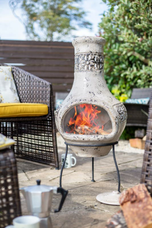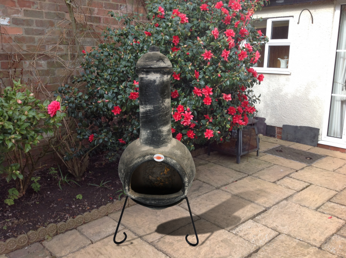 Vacker trädgårdsdekoration med mycket mysfaktor. En lerkamin som pryder uteplatsen och ger värme.
